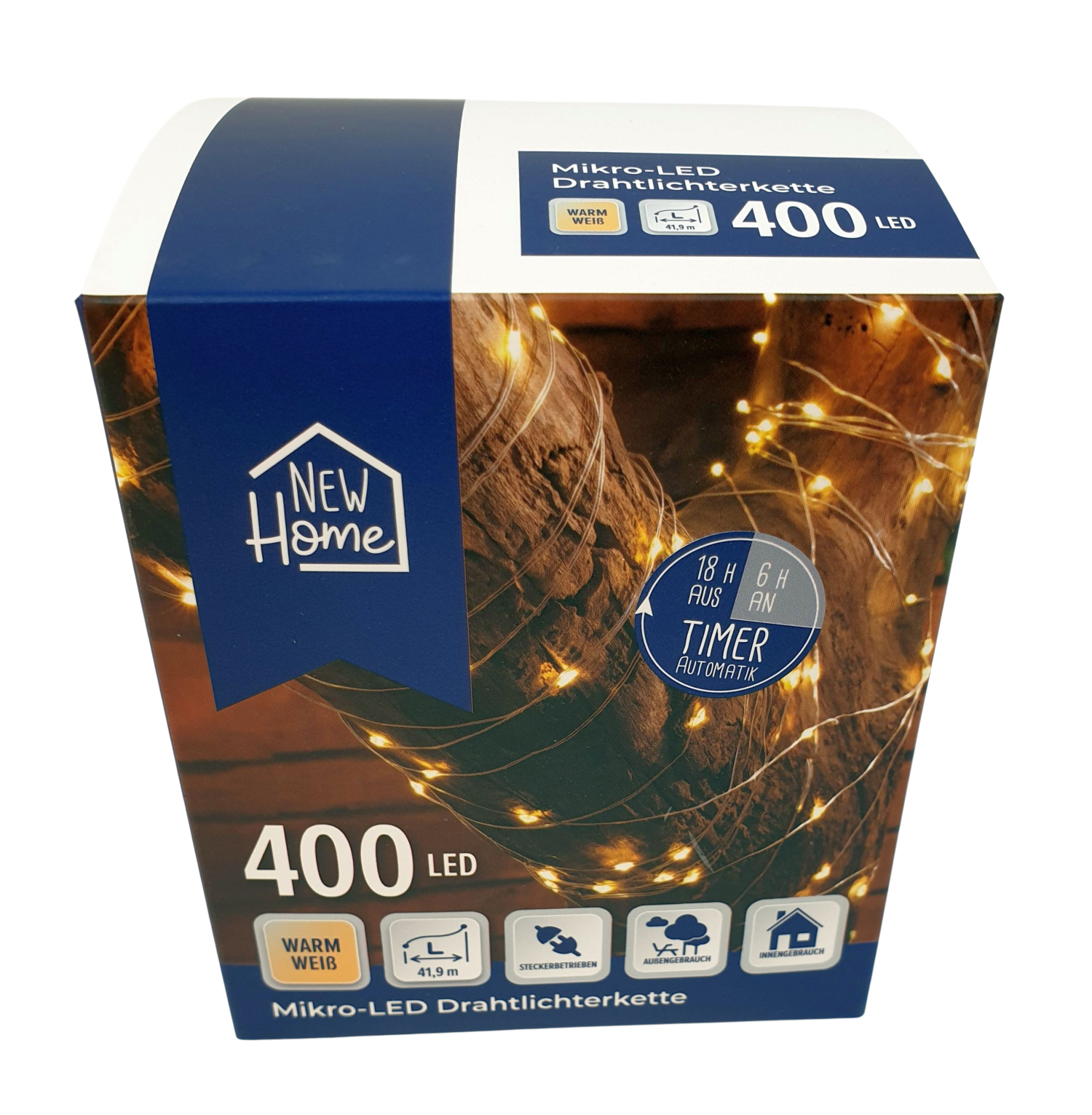 Biegbare Drahtlichterkette mit 400 Micro-LED-Lämpchen in warmweißer Leuchtfarbe. Durch den biegbaren, silberfarbenen Draht können diverse Gegenstände, z.B. Baumstämme oder Säulen im Vorgarten, besonders gut umwickelt und perfekt in Szene gesetzt werden. Der praktische Timer bietet Ihnen ein besonderes Extra. Wenn Sie die Lichterkette einschalten und den Timer betätigen, leuchtet diese 6 Stunden und schaltet sich danach für 18 Stunden automatisch aus. Diese tolle Lichterkette ist genau das Richtige für eine zauberhafte Stimmung im Garten, auf der Terrasse oder im Innenbereich.