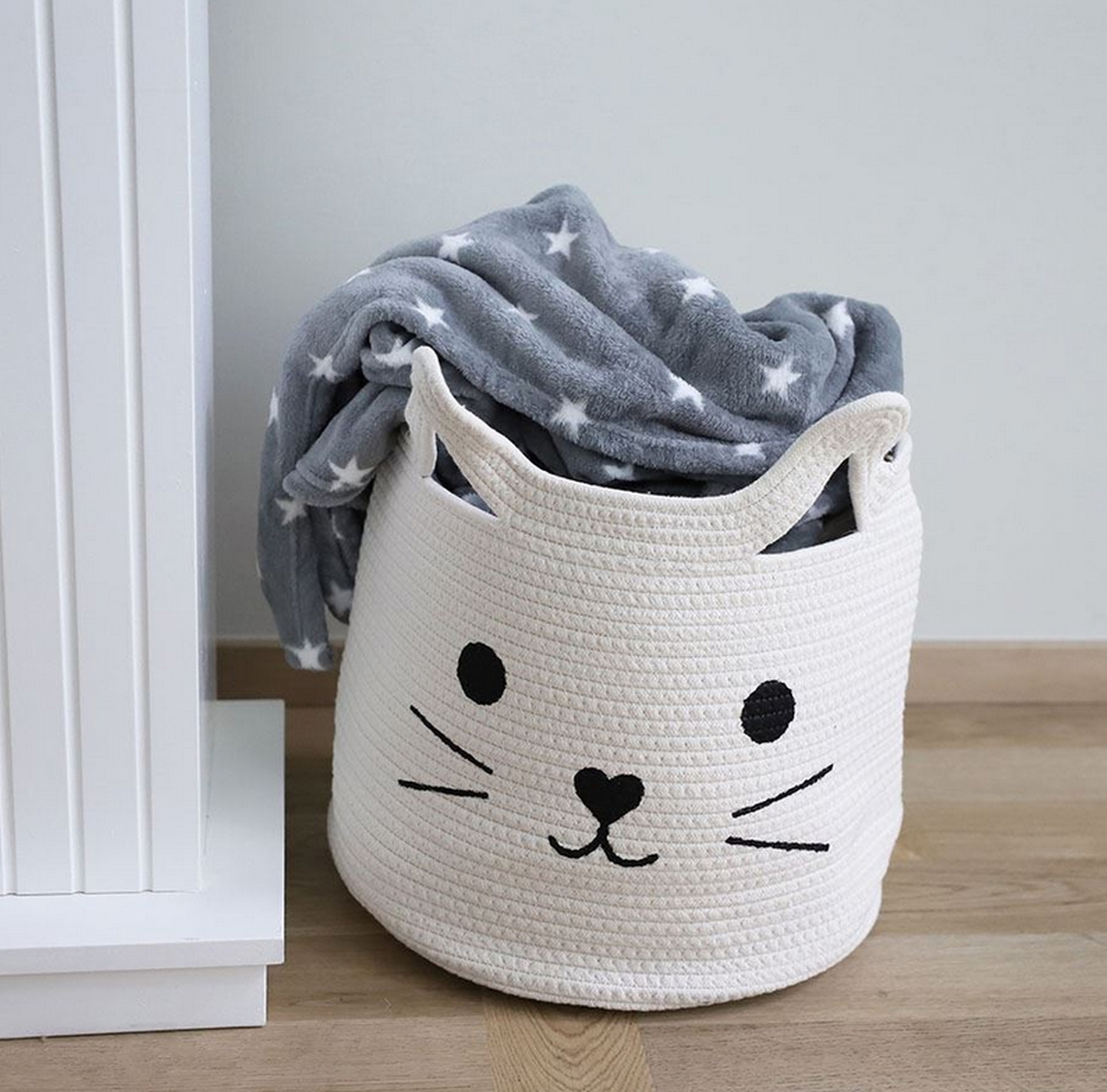Dieser niedliche Korb in Katzenoptik eignet sich zur Aufbewahrung von diversem Spielzeug, Kuscheldecken, Strick- und Nähzeug oder Zeitschriften. Bei Nichtgebrauch lässt sich dieser schöne Korb leicht zusammen legen.