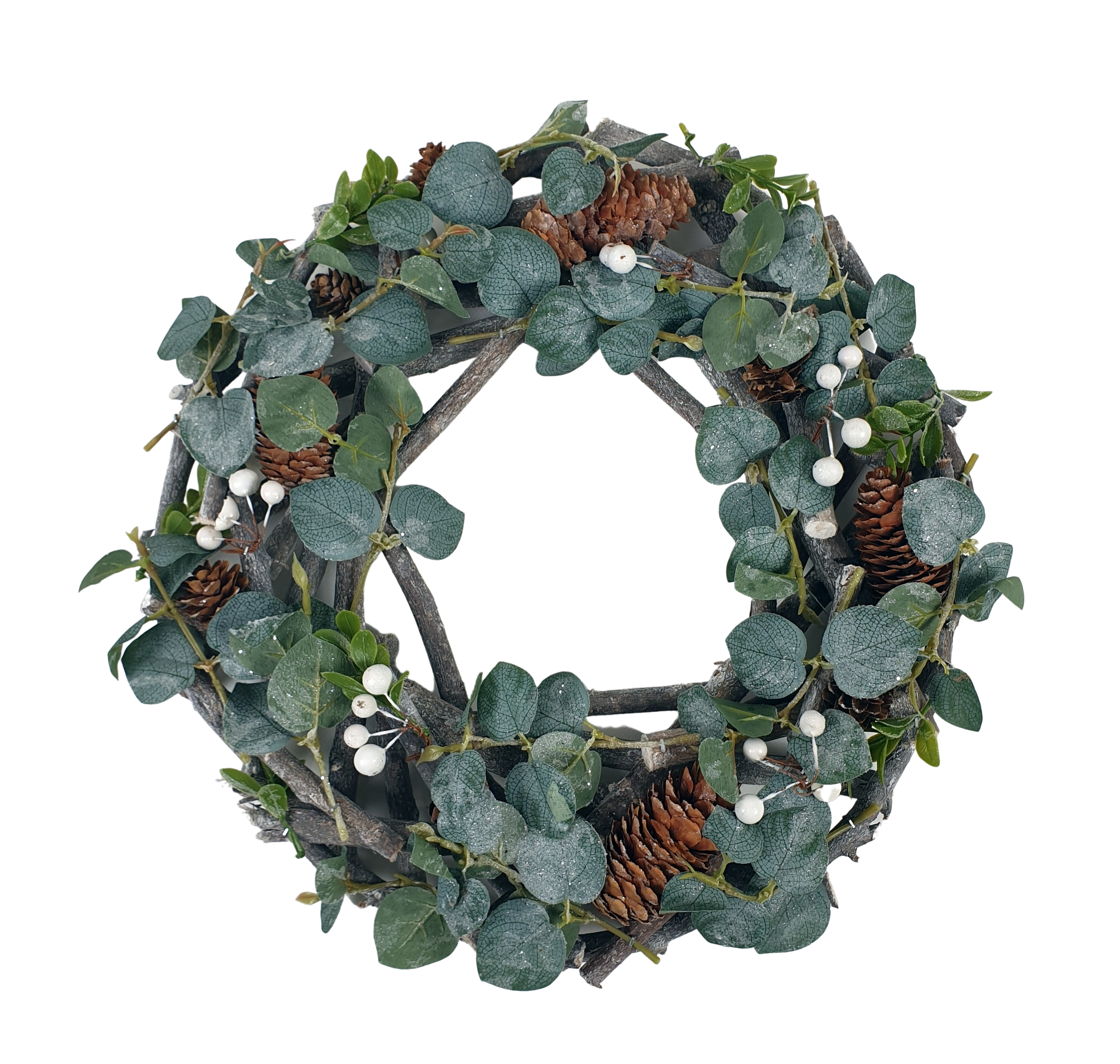 Dekorativer Winterkranz mit üppiger Anordnung von Tannenzapfen, künstlichen Beeren, künstlichen Zweigen und Blättern auf einem stabilen Holzgestell. Das winterliche Ambiente des Kranzes und die saisonale Deko macht ihn zu einem ausgezeichneten Deko-Hingucker in der vierten Jahrezeit.