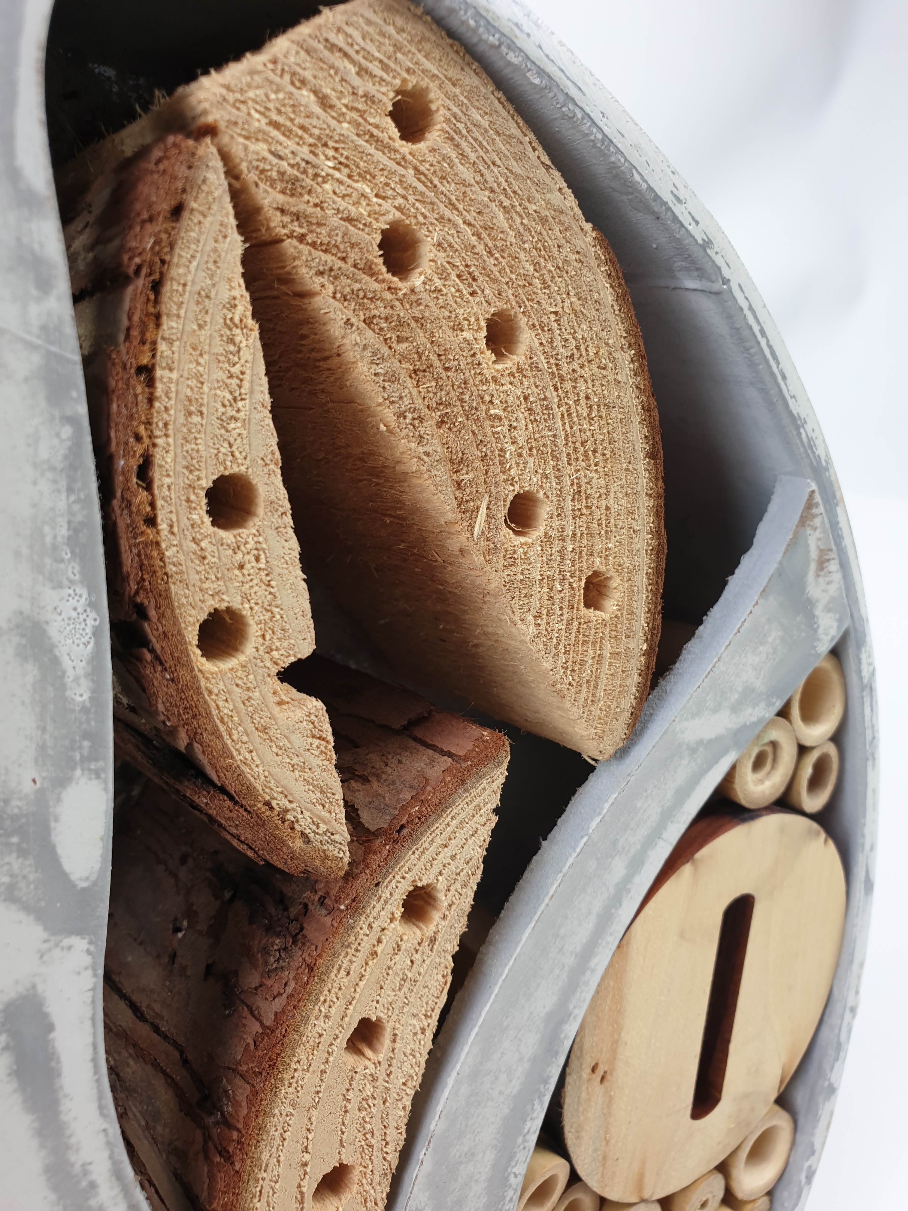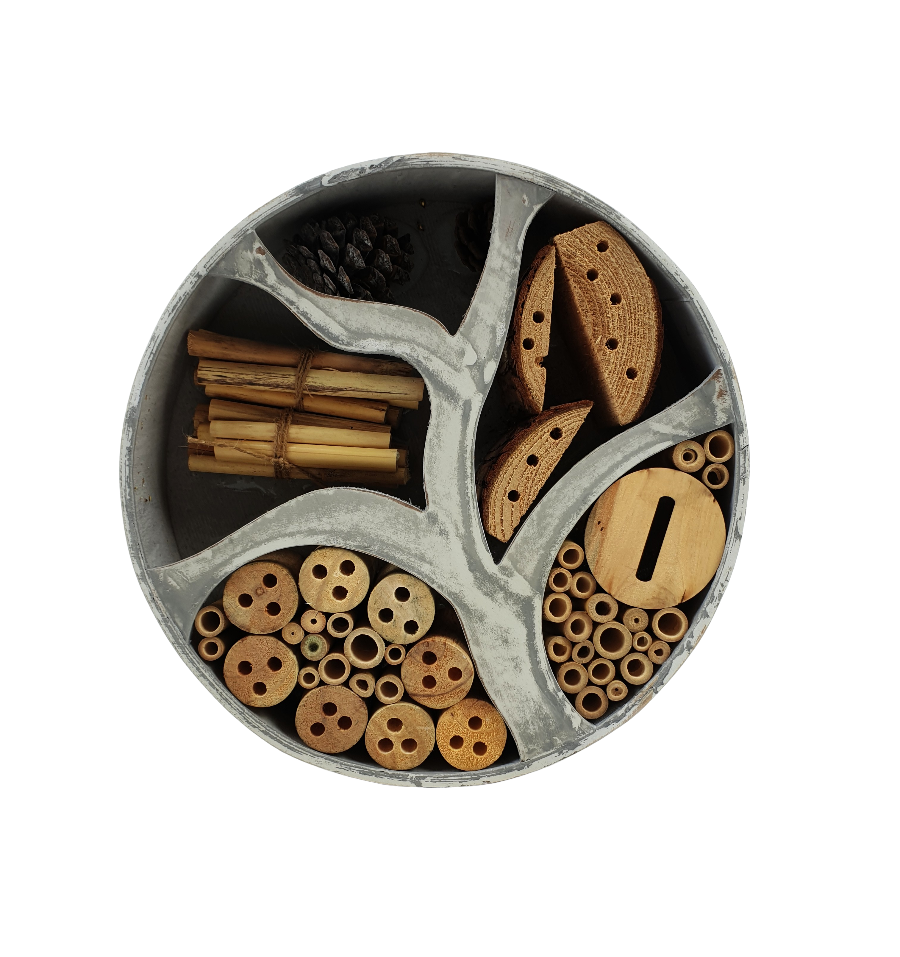 Dieses runde Insektenhotel bietet vielfältige Nist- und Überwinterungsplätze für Insekten wie Marienkäfer, Schmetterlinge, Mauerwespen und vielen mehr.