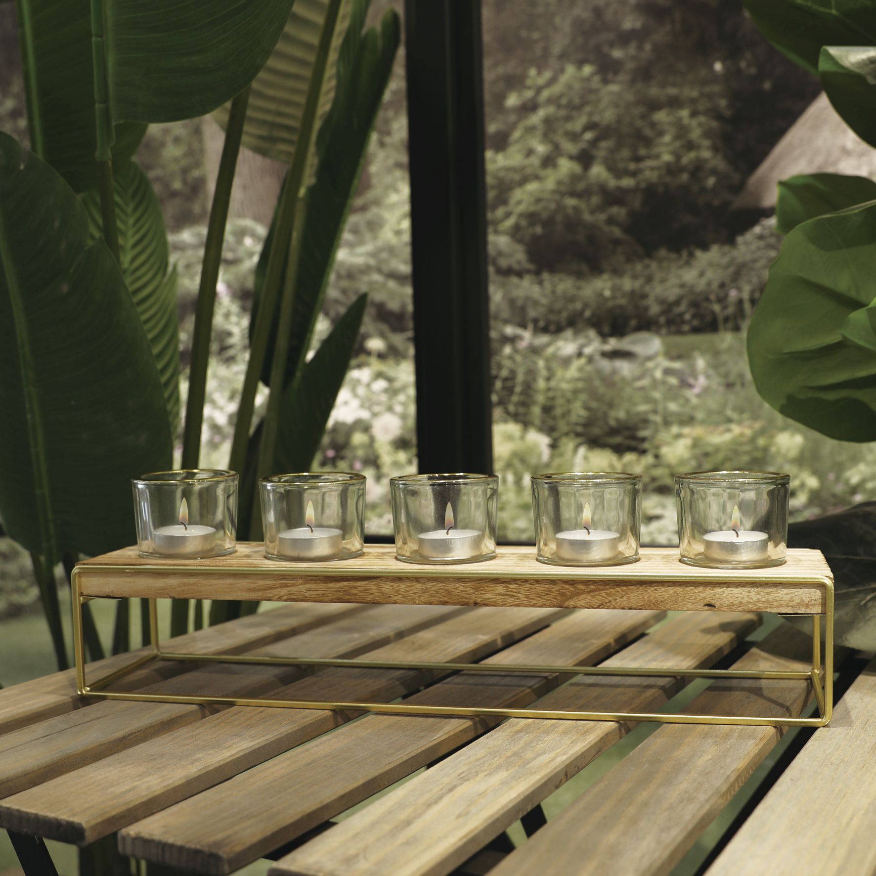 Kerzenhalter für Teelichter oder kleine Kerzen, der mit seiner Kombination aus Metall, Holz und Glas für eine gemütliche Stimmung in ihrem Zuhause sorgt.