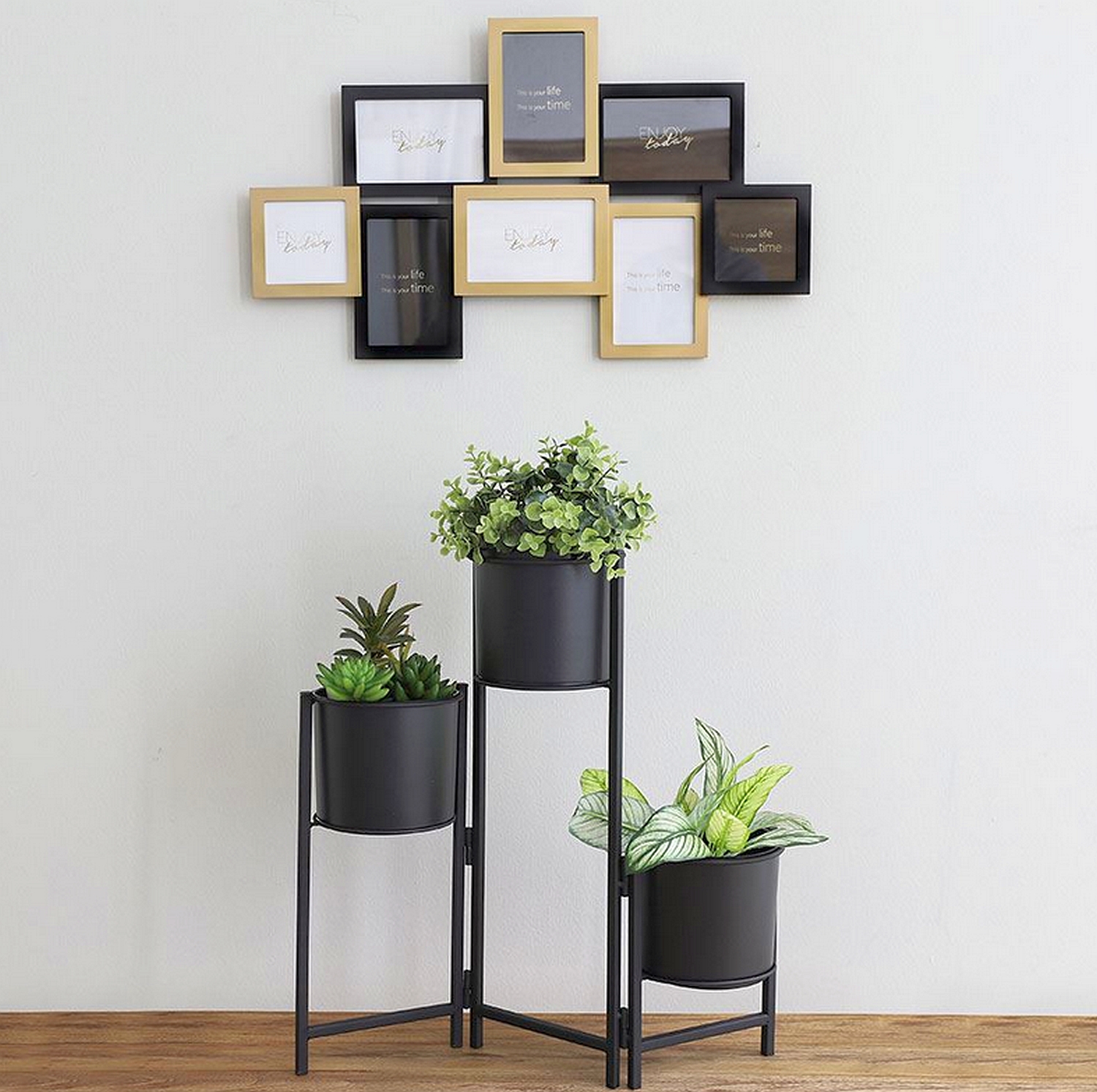 Dieser moderne Blumenständer aus Metall verleiht Ihrem Zuhause das gewisse Etwas und sorgt bepflanzt für ein besonderes Highlight. Die Blumentöpfe befinden sich auf unterschiedlichen Höhen, können separat heraus genommen und stilvoll bepflanzt werden. Das faltbare Gestell ist an 2 Punkten beweglich und lässt sich je nach Geschmack verstellen und platzieren. (ohne Pflanzen)