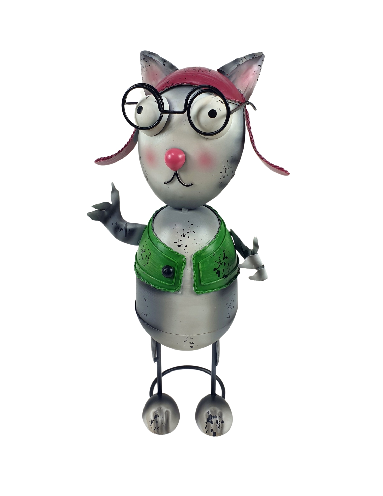 Die süße 42 cm hohe Deko-Katze aus Metall ist ein niedliches und lustiges Deko-Accessoire für ihr Zuhause und ihren Garten. Kleine Details, wie die Fliegermütze, oder die grüne Weste, machen die Katze zu einem echten Hingucker. Der Metallring verleiht der Katze einen sicheren Stand.