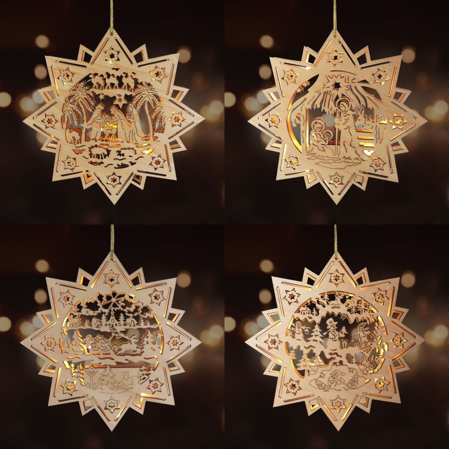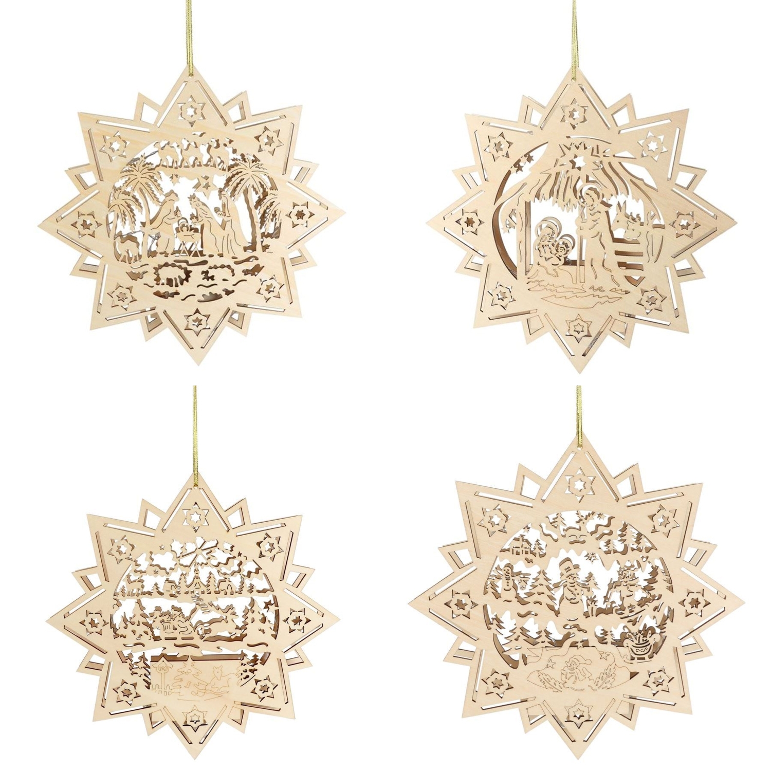 Dekorativer Holzstern zum Aufhängen mit weihnachtlichem Motiv